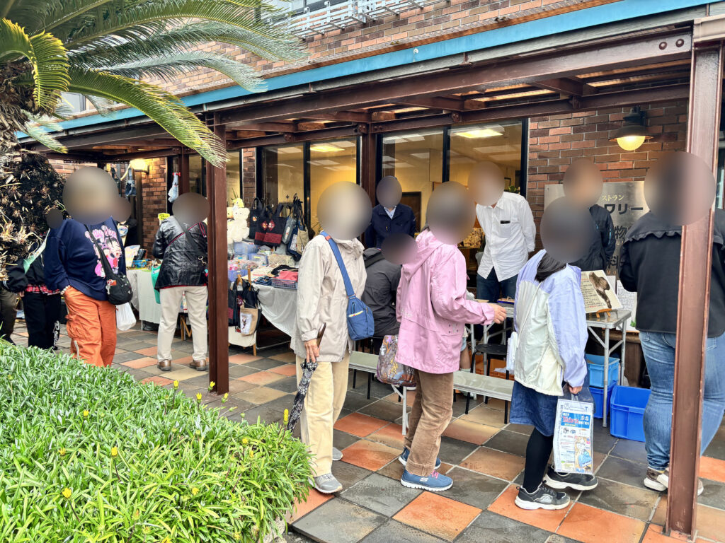 雨天時の開催風景:出展可能な方が集まって、店舗前の軒下をお借りしました